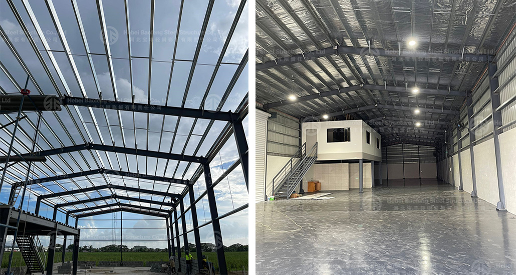 Clear-Span Interiors: Steel frames can create large, column-free spaces in the warehouse area, maximizing storage and operational flexibility.